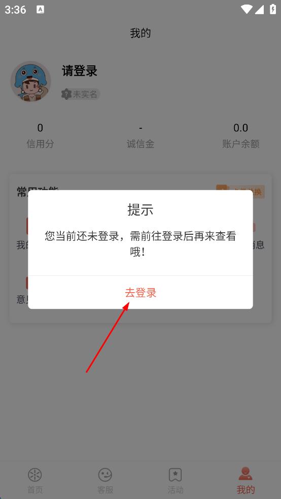 2、在個人中心頁面,看到“請登錄”提示,點擊后會彈出提示框,提示需前往登錄,點擊“去登錄”,進入登錄選擇界面。