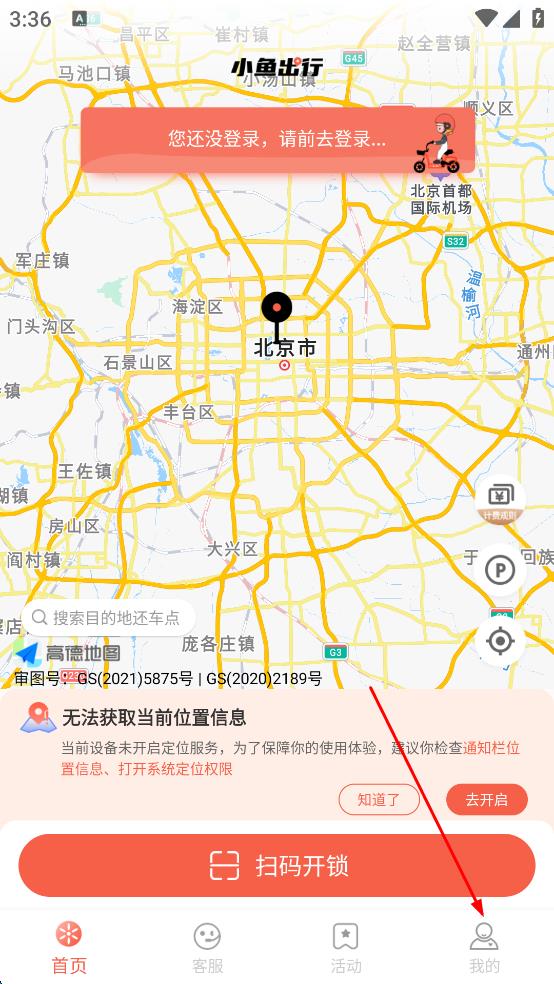 1、打開小魚出行APP,進入首頁后,點擊頁面底部右側(cè)“我的”選項,進入個人中心頁面。