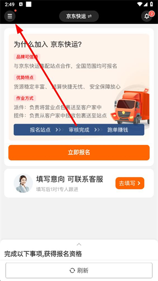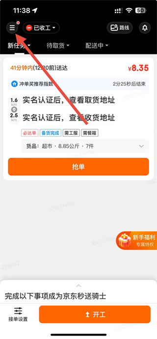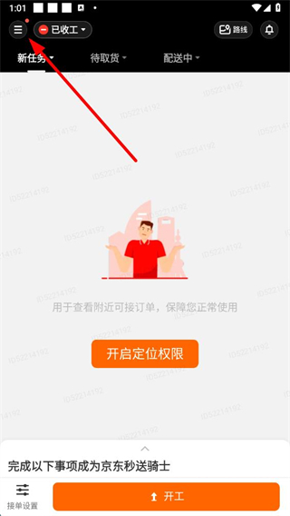 1、進(jìn)入京東秒送騎士界面后,點(diǎn)擊左上角菜單按鈕,展開功能選項(xiàng)。