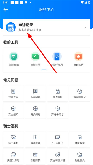 3、在服務(wù)中心頁面點(diǎn)擊申訴記錄選項(xiàng),進(jìn)入申訴中心頁面。