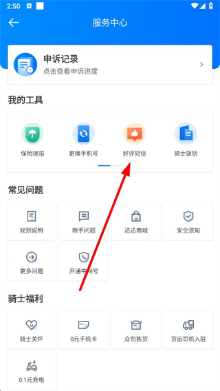 3、在服務(wù)中心的我的工具板塊中,點(diǎn)擊好評短信選項(xiàng),進(jìn)入求好評短信設(shè)置頁面。