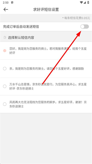 4、在頁面打開完成訂單后自動發(fā)送短信的開關(guān),再選擇默認(rèn)短信內(nèi)容,后續(xù)完成訂單后會自動發(fā)送好評短信。