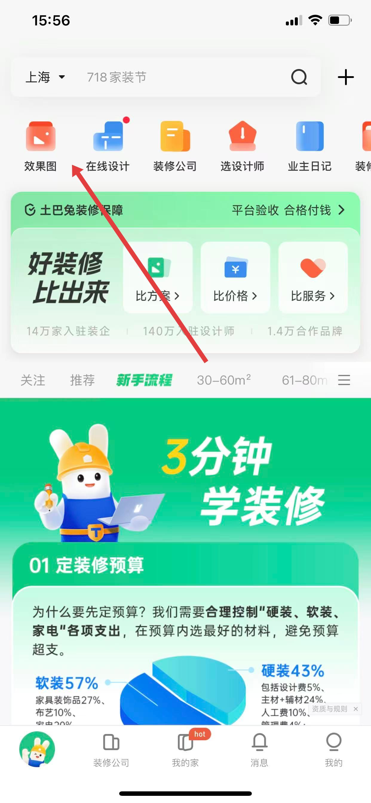 1、打開土巴兔裝修App,在首頁點(diǎn)擊效果圖選項(xiàng)。