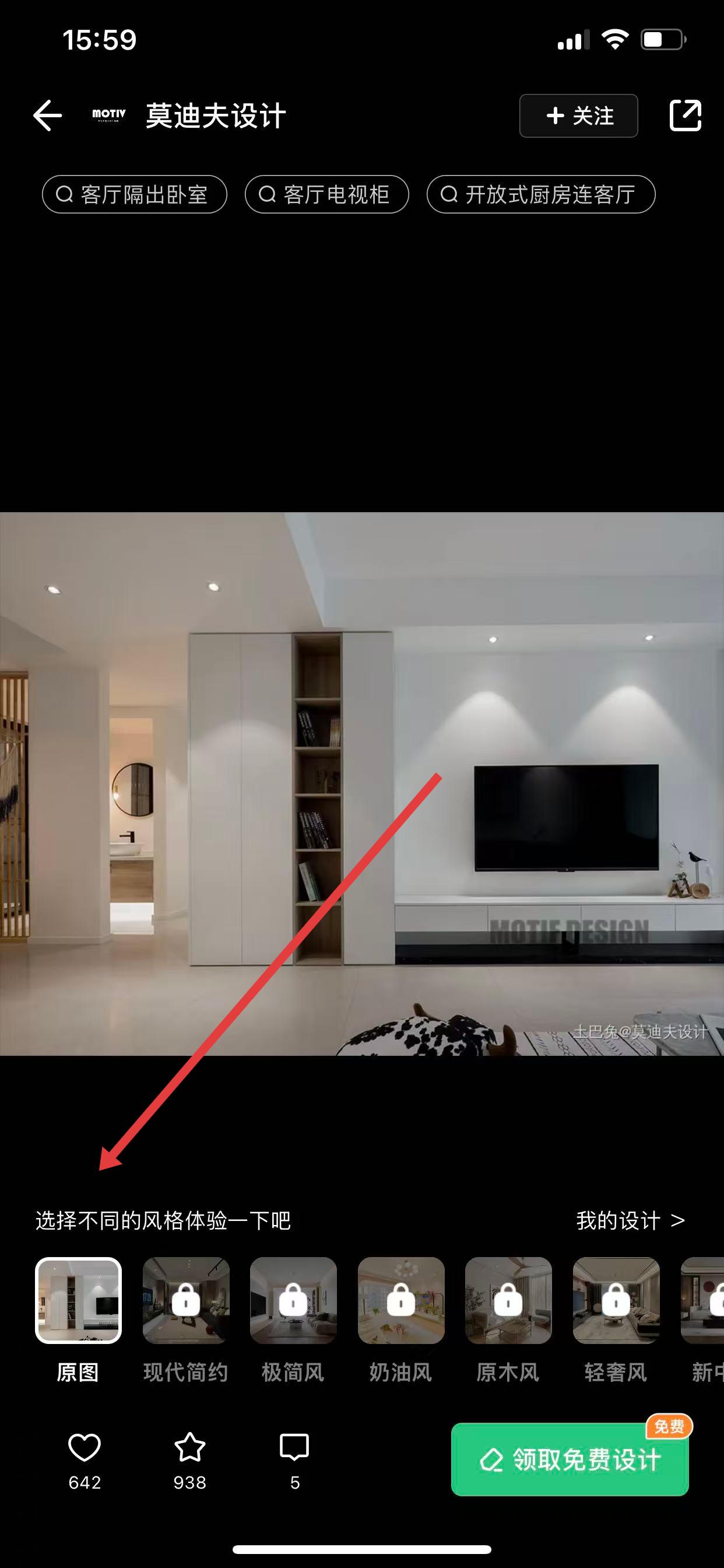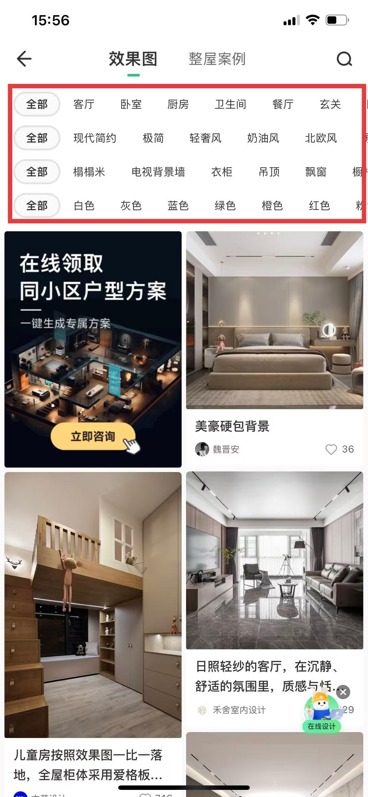 2、有按照空間、風(fēng)格、元素、顏色分類的標(biāo)簽,根據(jù)需求點(diǎn)擊相應(yīng)標(biāo)簽。