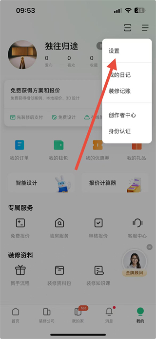 1、進(jìn)入土巴兔APP我的頁面,點(diǎn)擊右上角三條橫線的菜單按鈕,選擇設(shè)置選項(xiàng)。