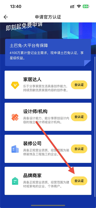 3、在申請(qǐng)官方認(rèn)證頁面,找到品牌商家,點(diǎn)擊去認(rèn)證。