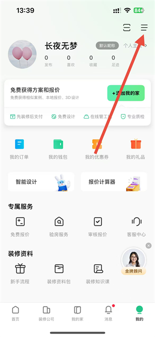 1、打開土巴兔裝修app,進(jìn)入我的頁面,點(diǎn)擊右上角三條橫線圖標(biāo)。