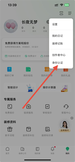 2、在彈出的菜單中,點(diǎn)擊身份認(rèn)證選項(xiàng),進(jìn)入申請(qǐng)頁面。