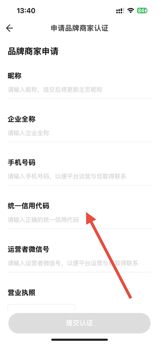 4、在申請(qǐng)品牌商家認(rèn)證頁面,填寫信息,上傳營(yíng)業(yè)執(zhí)照后點(diǎn)擊提交認(rèn)證。
