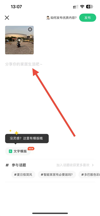 4、在編輯頁面,填寫分享文案,可添加話題等內(nèi)容,點(diǎn)擊右上角發(fā)布按鈕完成視頻教程發(fā)布。