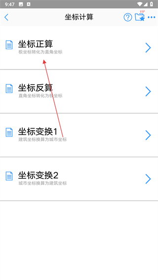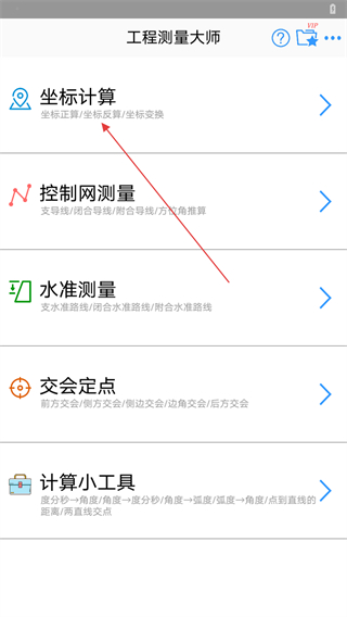 1、打開工程測量大師應(yīng)用,點(diǎn)擊坐標(biāo)計(jì)算選項(xiàng),進(jìn)入坐標(biāo)計(jì)算功能界面。