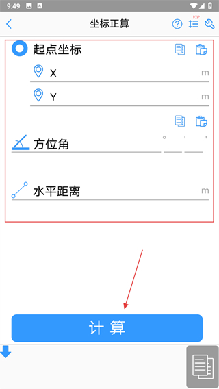 3、在坐標(biāo)正算頁面,依次輸入起點(diǎn)坐標(biāo)、方位角以及水平距離,輸入完成后點(diǎn)擊計(jì)算按鈕。