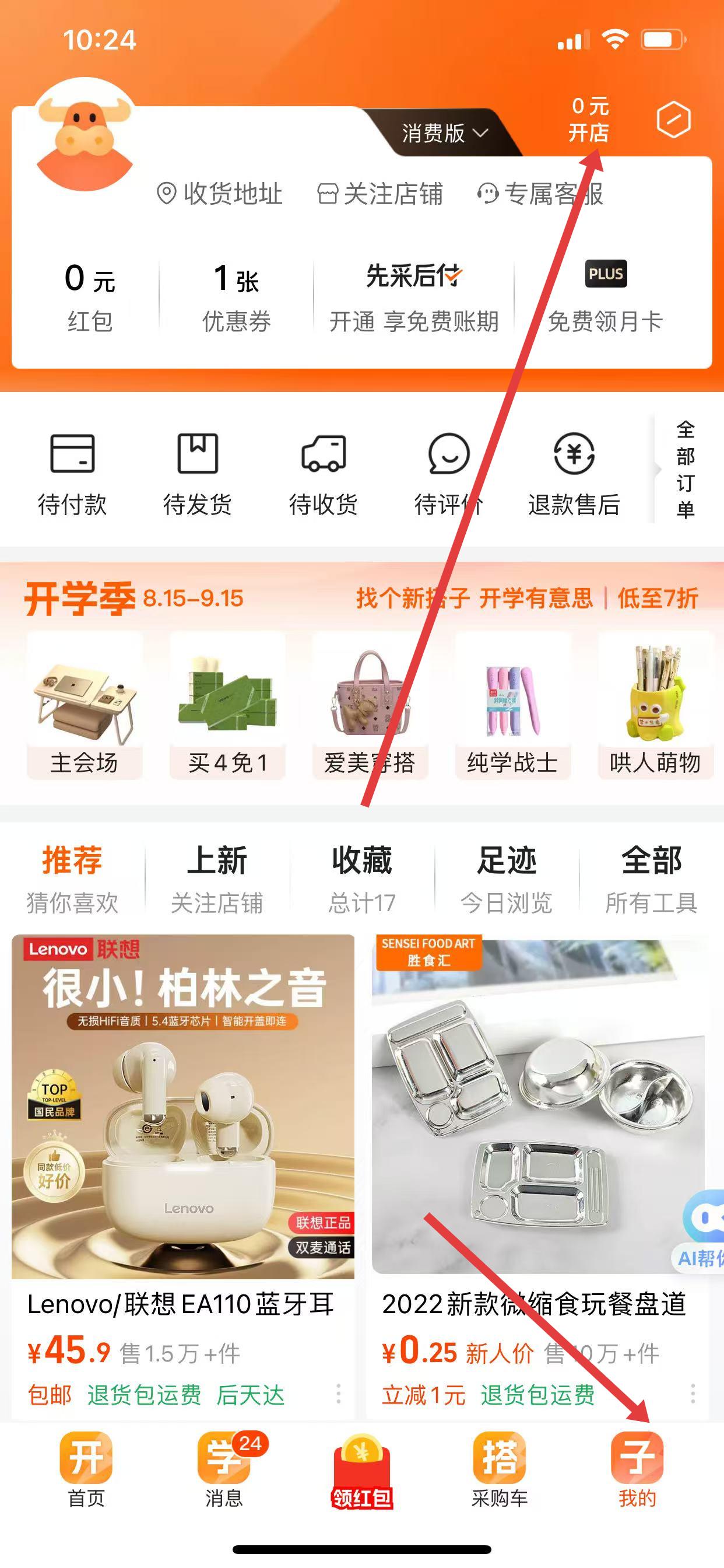 1、打開1688APP,點(diǎn)擊右下角「我的」,選擇頁面右上方的「0元開店」選項(xiàng)。