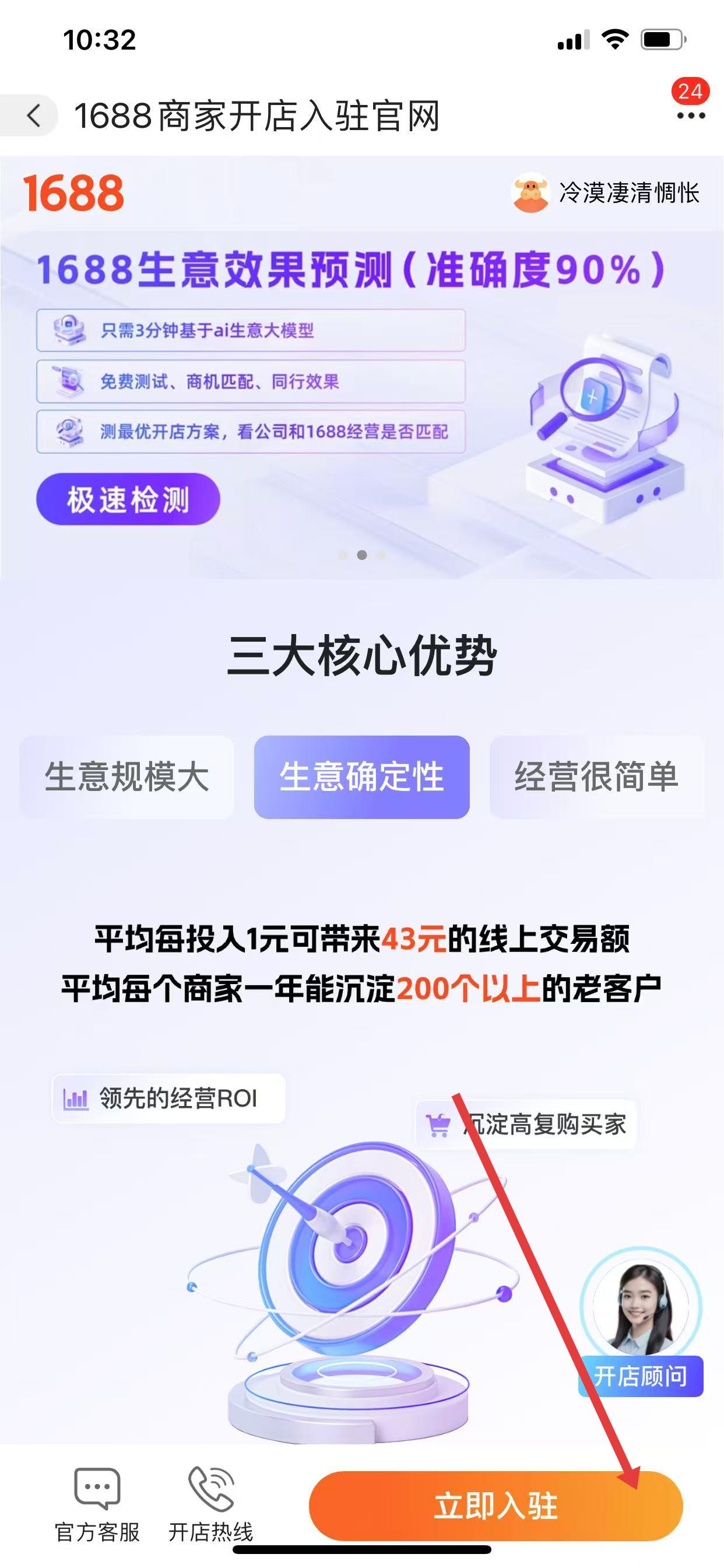 2、進(jìn)入1688商家開店入駐官網(wǎng)頁面,點(diǎn)擊「立即入駐」按鈕。