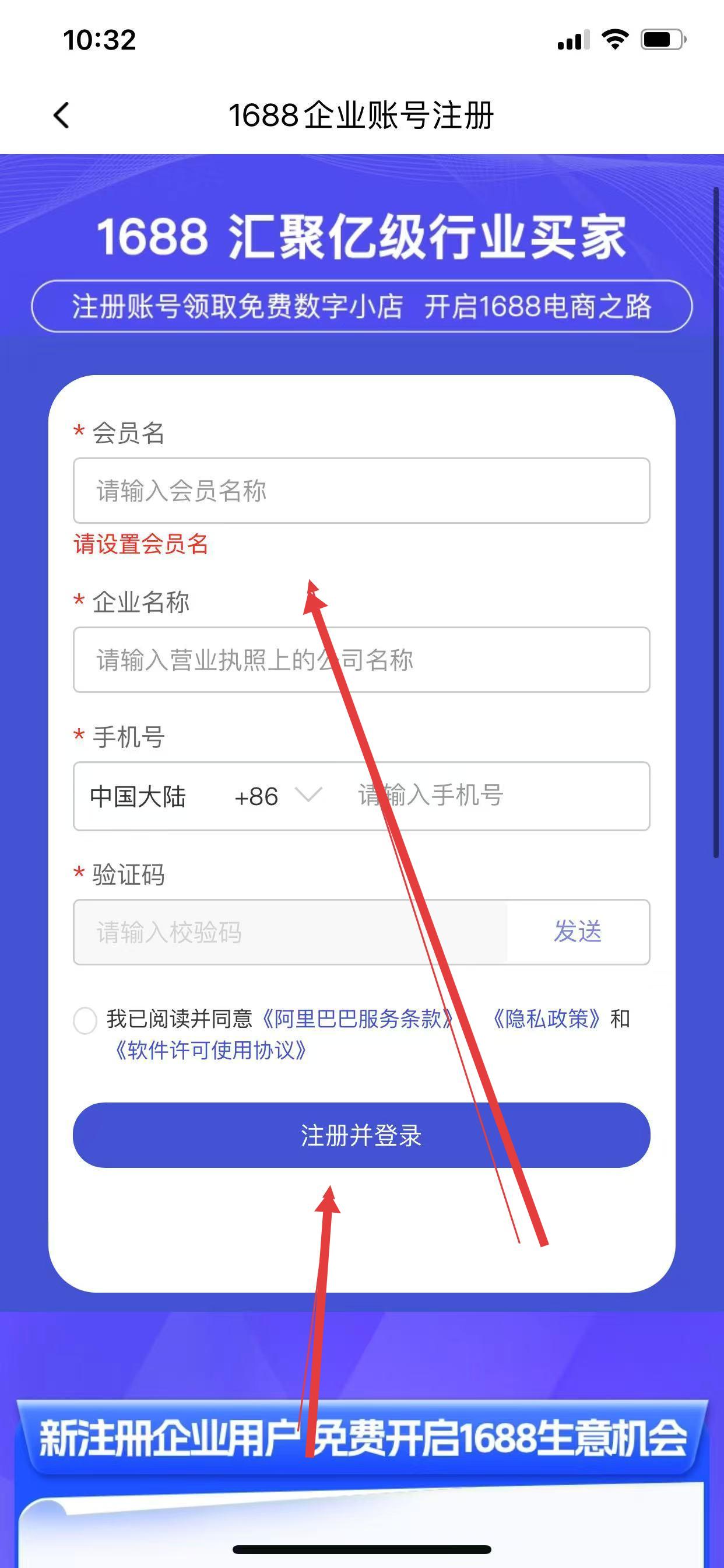 3、在企業(yè)賬號注冊界面,依次填寫會員名、企業(yè)名稱、手機(jī)號并獲取驗(yàn)證碼,勾選同意相關(guān)協(xié)議后點(diǎn)擊「注冊并登錄」。