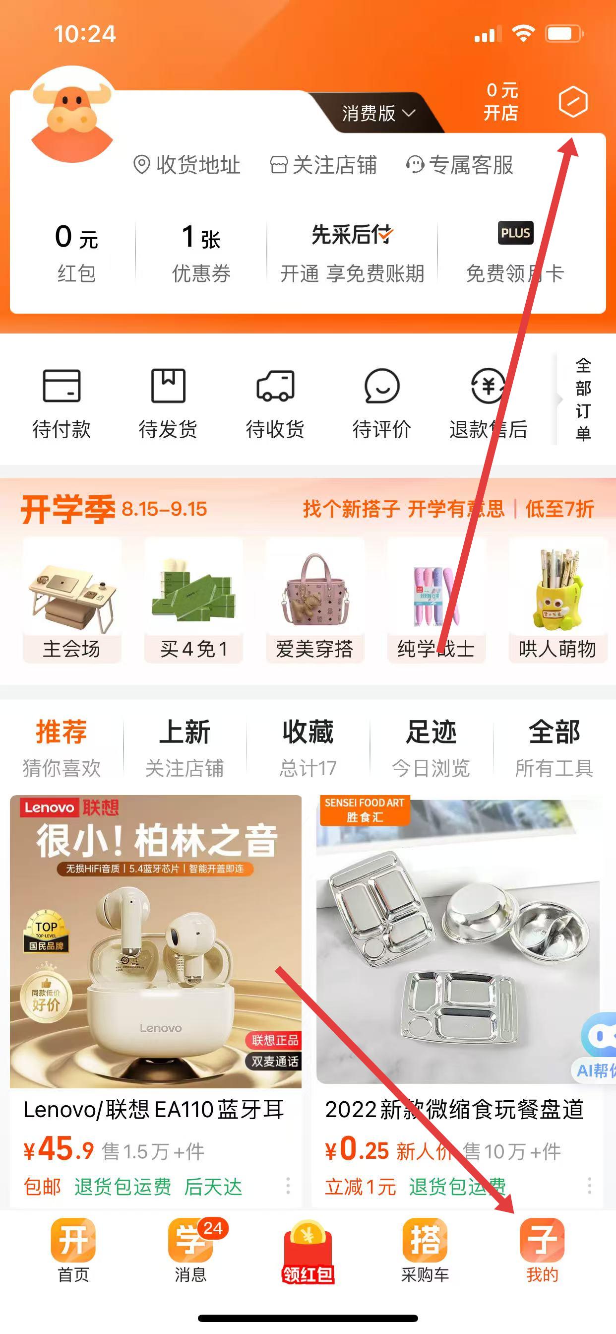1、打開(kāi)1688APP,點(diǎn)擊右下角我的,再點(diǎn)擊右上角的設(shè)置圖標(biāo),進(jìn)入設(shè)置頁(yè)面。
