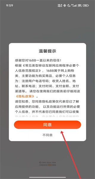 1、點(diǎn)擊“溫馨提示”彈窗的“同意”,進(jìn)入1688APP主界面。