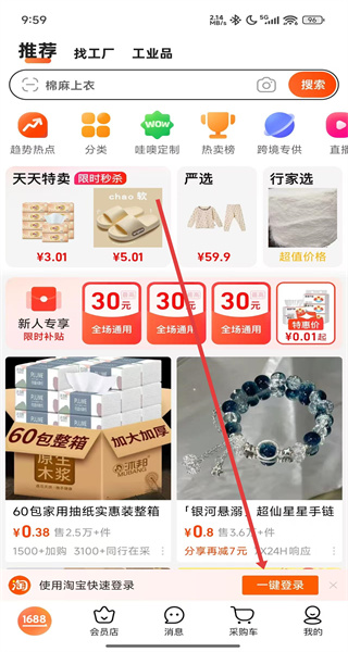 2、主界面點(diǎn)擊“一鍵登錄”,觸發(fā)淘寶賬號(hào)授權(quán)流程。