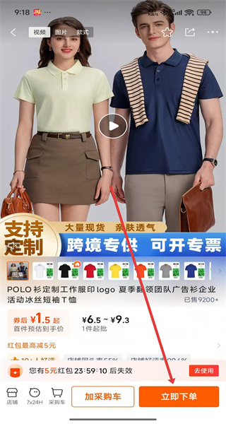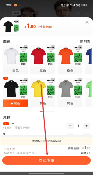 4、選擇顏色如黑色、尺碼M等規(guī)格后,點(diǎn)擊“立即下單”,完成下單流程。