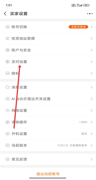 2、在進(jìn)入到買(mǎi)家設(shè)置頁(yè)面后,可以點(diǎn)擊支付設(shè)置選項(xiàng),進(jìn)入設(shè)置。