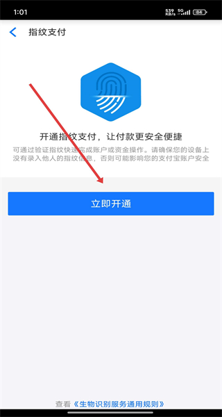 4、進(jìn)入到指紋支付開(kāi)通頁(yè)面,點(diǎn)擊下方立即開(kāi)通按鈕,即可開(kāi)始開(kāi)通指紋支付功能。