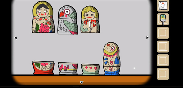 9.把俄羅斯套娃全部分開,最后有朵花,把它拿起來根據(jù)圖案放進第一個套娃里,合上蓋兒再打開,這樣來回放再開蓋兒,會依次得到魚骨頭,血滴,最后是一把鑰匙。