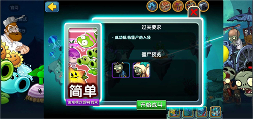 2、接著我們?cè)谕P(guān)要求中可以提前進(jìn)行僵尸預(yù)覽,看看接下來(lái)入侵的僵尸是什么類型,看完后,點(diǎn)擊【開(kāi)始戰(zhàn)斗】即可開(kāi)始游戲;
