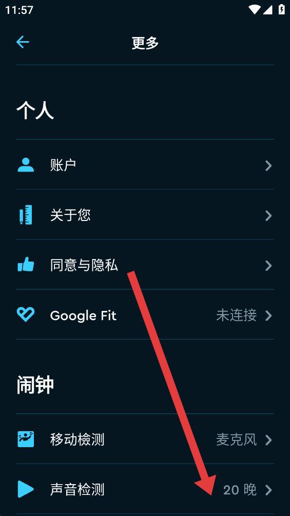 3、進(jìn)入更多設(shè)置頁面后,在鬧鐘板塊下,點(diǎn)擊聲音檢測(cè)選項(xiàng)。