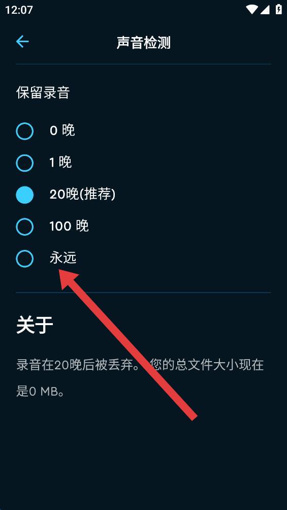 4、在聲音檢測(cè)設(shè)置頁面,選擇永遠(yuǎn),這樣就能保存全部的錄音。
