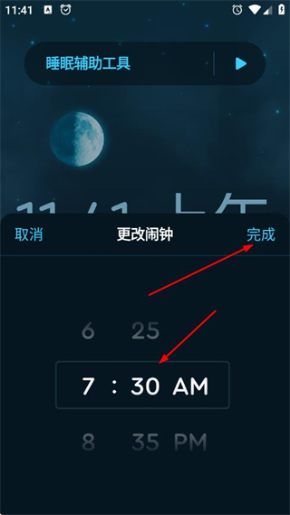 4、在更改鬧鐘界面設(shè)置好鬧鐘時(shí)間后,點(diǎn)擊完成,即可完成鬧鐘設(shè)置。