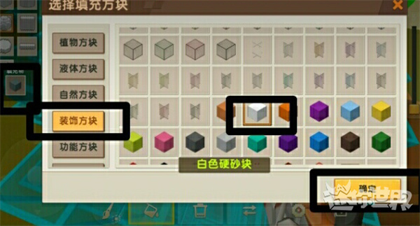 選擇填充物在填充物中找到裝飾方塊,再?gòu)难b飾方塊中找到白色硬沙塊。找到之后點(diǎn)擊右下角確定。