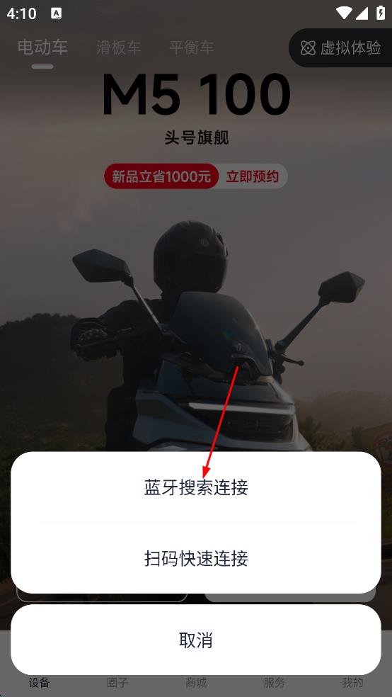 3、在綁定設(shè)備頁面,會彈出連接方式選擇,點(diǎn)擊“藍(lán)牙搜索連接”,軟件將通過藍(lán)牙搜索附近九號設(shè)備,完成設(shè)備綁定流程 。