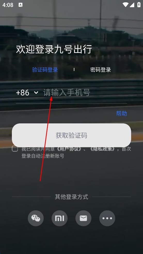 1、打開九號出行軟件,進(jìn)入登錄頁面,選擇驗(yàn)證碼或密碼登錄方式,在手機(jī)號輸入框填寫手機(jī)號碼,勾選同意用戶協(xié)議和隱私政策,點(diǎn)擊獲取驗(yàn)證碼準(zhǔn)備登錄。