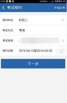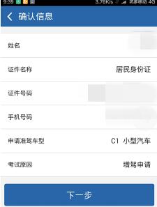 3.核對(duì)自己信息,確認(rèn)無(wú)誤后,點(diǎn)擊下一步。在這里要提醒下,因?yàn)橛行┤艘呀?jīng)是有摩托車證或者其他駕駛證,所以我們可以看到考試原因?qū)懼涸鲴{申請(qǐng)。一般無(wú)證新手申請(qǐng)都是寫著:初次申請(qǐng)。