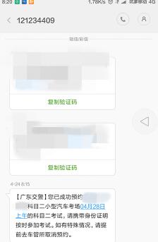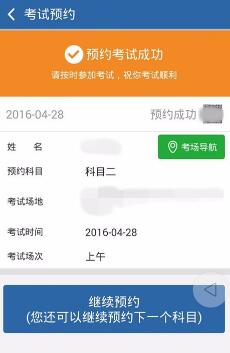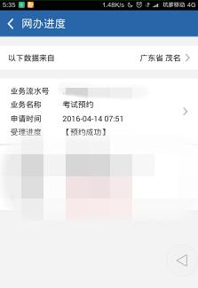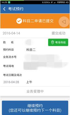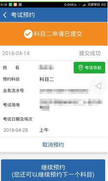 5.當(dāng)我們操作完畢后,可以通過點(diǎn)擊首頁(yè)的考試預(yù)約進(jìn)入,會(huì)出現(xiàn)提交成功提示,如下圖,等過二十分鐘后,“業(yè)務(wù)辦理中”變成“取消預(yù)約”;