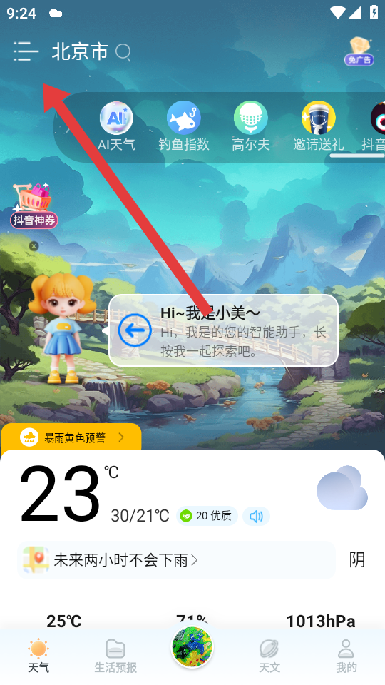 1、打開最美天氣APP,點擊左上角三橫線圖標,進入城市管理的界面,開啟位置變更操作流程。