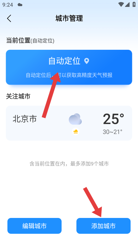2、在城市管理頁面,可點擊自動定位獲取當前位置天氣,也可以點擊添加城市,手動選擇目標城市。