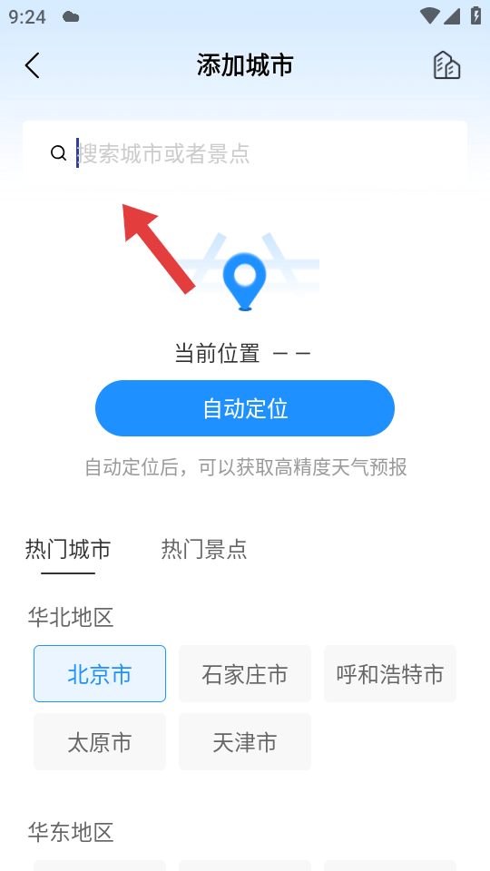 3、這邊選擇進入添加城市頁面后,在搜索框輸入城市名稱/景點,或直接點擊熱門城市列表中的目標城市,即可切換定位至該城市。