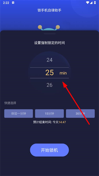 3、在頁面選擇設(shè)置需要的鎖定時長,點擊開始鎖機按鈕,即可啟用強制鎖機功能。