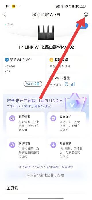 2、進入設(shè)備詳情頁面后,點擊右上角的設(shè)置圖標(biāo),跳轉(zhuǎn)至路由器設(shè)置界面,可查看設(shè)備型號、IP地址等信息。