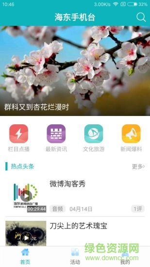 海東手機臺app是一款精彩的電子直播軟件。為海東市民帶來了多套新聞直播、電視直播頻道,市民可以借助于手機客戶端玩轉(zhuǎn)節(jié)目互動、影音收聽,盡情掌上視聽體驗!快來綠色資源網(wǎng)下載吧。