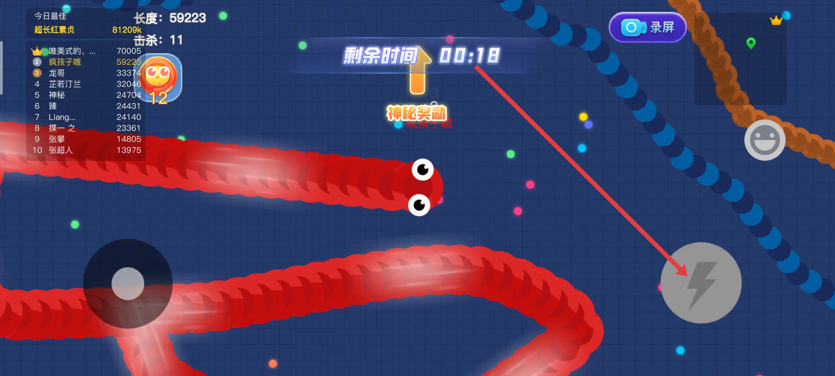3、靈活使用右下角的加速按鈕,加速可以幫助你快速靠近食物,或者在關(guān)鍵時(shí)刻躲避其他大蛇的攻擊,或者需要快速擺脫危險(xiǎn)時(shí)使用加速功能,提高生存和成長(zhǎng)的幾率。