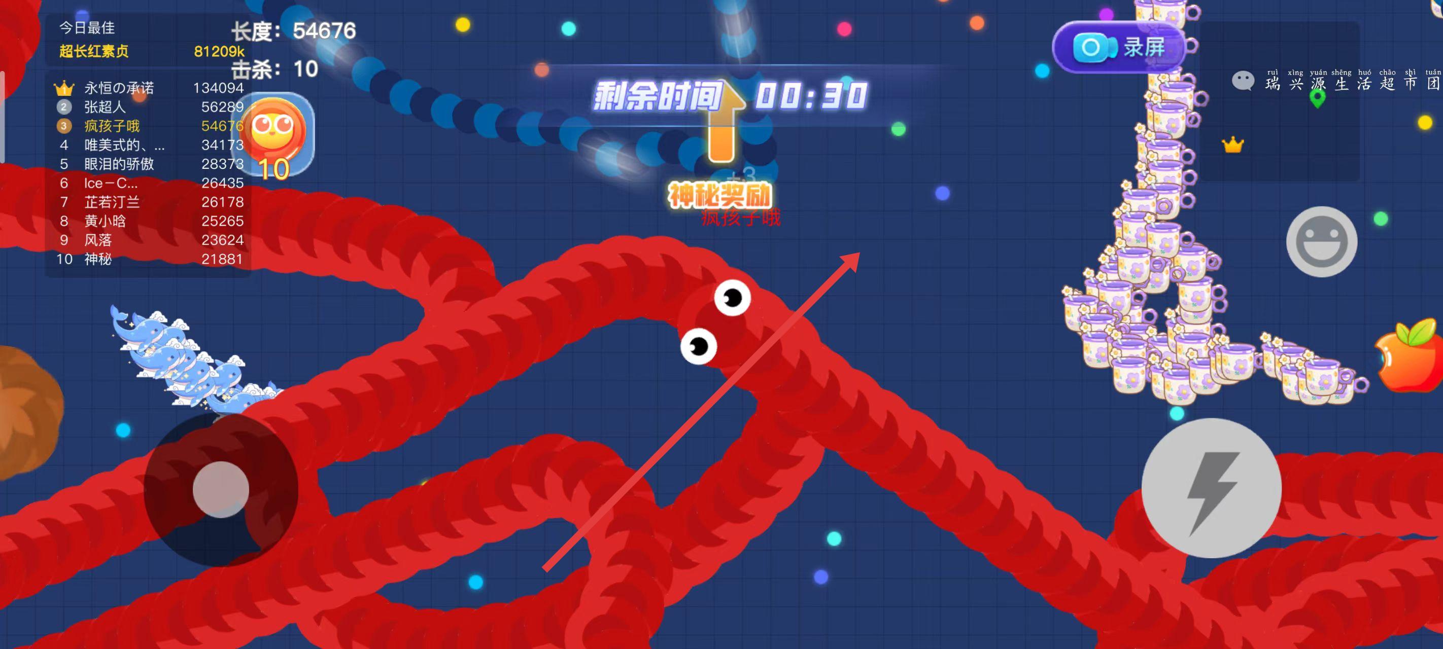 3.長(zhǎng)按加速鍵,用巧妙的走位讓蛇身被別人撞上,就可以吃掉尸體迅速變長(zhǎng)。