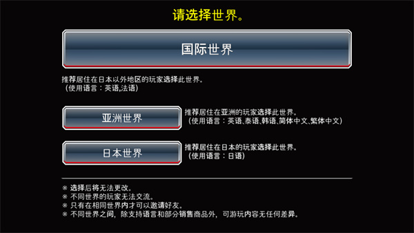 3、選擇您的世界,國服玩家建議選擇亞洲世界,可以使用簡體中文語言進(jìn)行游玩,選擇后將無法更改;