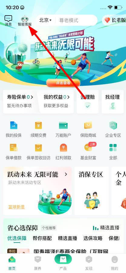 1、打開中國國壽e店APP,進入首頁界面,點擊左上角的智能客服按鈕,開啟尋找客服的第一步。