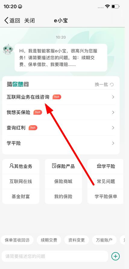 2、進入智能客服界面后,在顯示的常見問題列表中,若有符合自身需求的選項,比如互聯(lián)網(wǎng)業(yè)務在線咨詢,可直接點擊進入查看相關解答,若沒有繼續(xù)下一步。