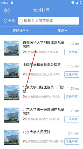 2、在實(shí)時(shí)掛號頁面,可選擇城市,通過搜索關(guān)鍵詞查找醫(yī)院。