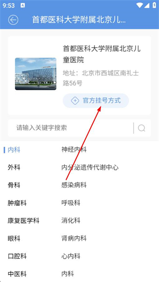 3、進(jìn)入醫(yī)院詳情頁面后,點(diǎn)擊官方掛號方式。
