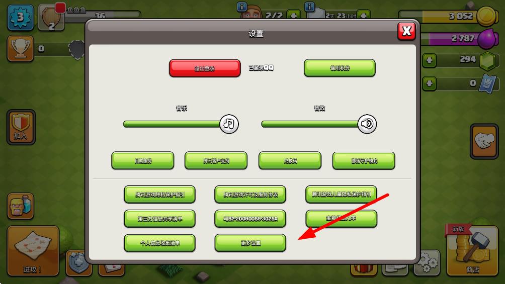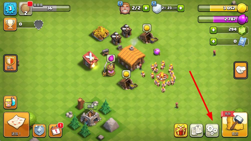 1、進(jìn)入部落沖突游戲主界面,點(diǎn)擊屏幕右下角的齒輪圖標(biāo),打開設(shè)置頁面。