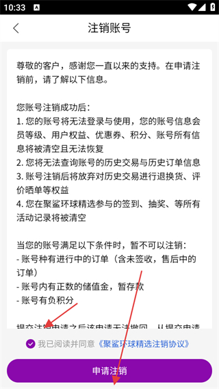 5、勾選我已閱讀并同意聚鯊環(huán)球精選注銷協(xié)議,點(diǎn)擊申請注銷。